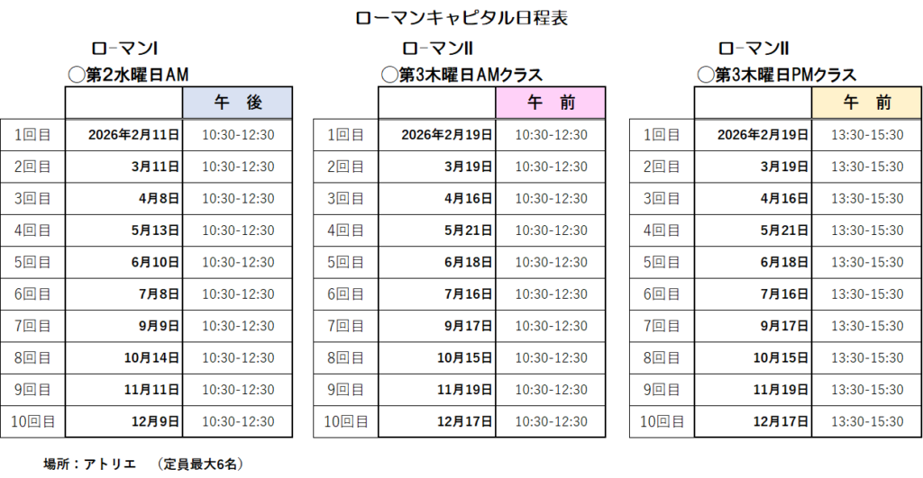 ローマンキャピタル体Ⅰ・Ⅱ神戸対面レッスン2026年2月スタートのご案内 ※全てオリジナルテキストを使用しています。1.レッスン概要 【ローマンキャピタルI】 キャピタル・モニュメンタリスから始まったローマンキャピタルの 歴史的背景や、文字の形、スペーシングを学んで行きます。 鉛筆でのスケルトン(モノライン)を学び、 それを使った作品を仕上げます。 その後はブロードエッジニブでセリフ無しのペンローマンまでを10回コースで学びます。 【ローマンキャピタルII】 Ⅰを学んだ方、若しくはローマンの基礎を学ばれた方を対象に、セリフについて、そして、フルセリフのローマンを学んで頂きます。 ウェイトを変えた文字にチャレンジしたり、フルセリフよりも少しカジュアルダウンしたセリフのアレンジなどを学び、 自分らしいローマンの作品を作っていきます。10回コースです。 2.レッスン日時などの詳細【料 金】55,000円 (10回分) (5,000円/1回×10回+消費税)【日 時】ローマンI(第2水曜日)募集を終了しました。 <10:30-12:30> ローマンII(第3木曜日) AMクラス<10:30~12:30> 残1席 PMクラス<13:30~15:30> 残2席 詳細は下記の表をご確認ください。8月お休み【定 員】6名【場 所】神戸アトリエ(神戸ハーバーランド内) 3.お申し込み方法タイトルに「ローマンキャピタル◯の申込について」として頂き、氏名・住所・電話番号・お振込方法(銀行or PayPay<手数料が加算されます>)を明記の上、下記のアドレスまで連絡をお願い致します。 ローマンキャピタルⅡをお申込みの方は、1:午前 2:午後 3:どちらでもよいを、ご記入ください。3日以内にお返事させて頂きますね。 E-mailアドレス: kazenoie2023@outlook.com (*直接やり取りがある方はLINEで連絡をください☆)